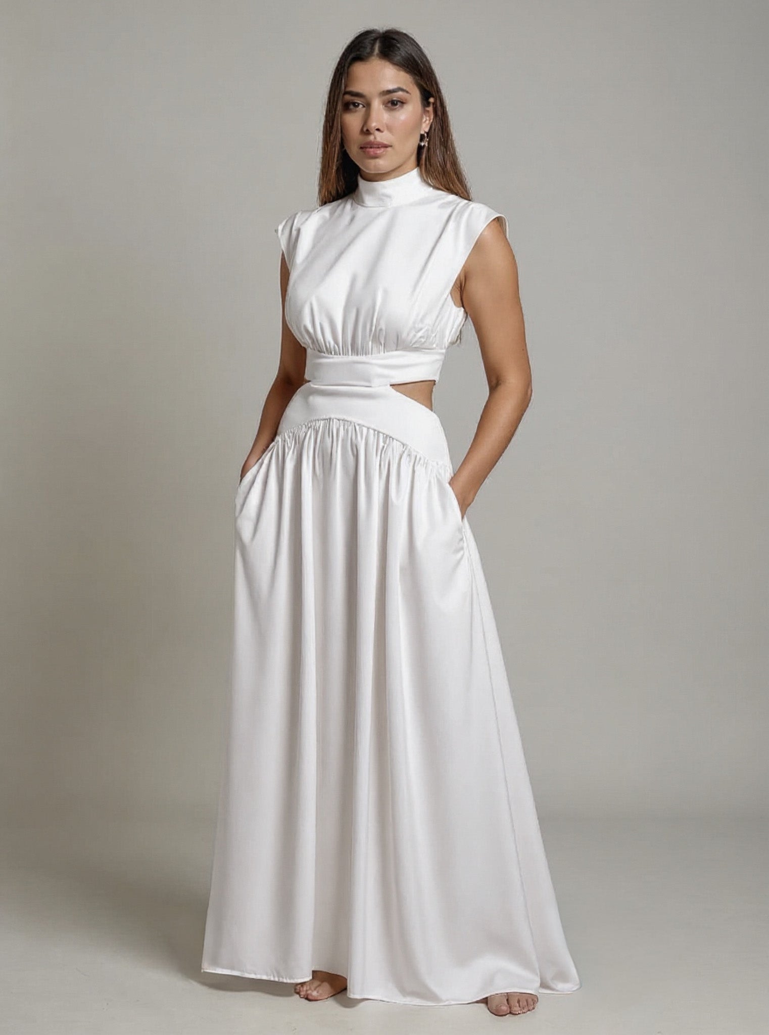 Un diseño de buen gusto que combina sofisticación con frescura. Este vestido largo en tono blanco tienen un corte fluido y femenino, ideal para ocasiones especiales. Su cuello alto y hombros ligeramente estructurados añaden un aire sofisticado, mientras que los cut-outs laterales en la cintura crean un detalle que estiliza la silueta.
