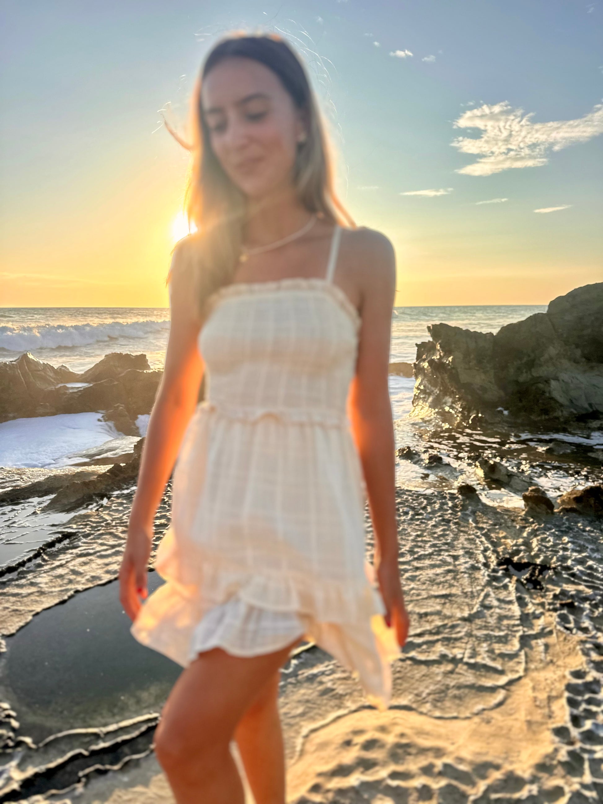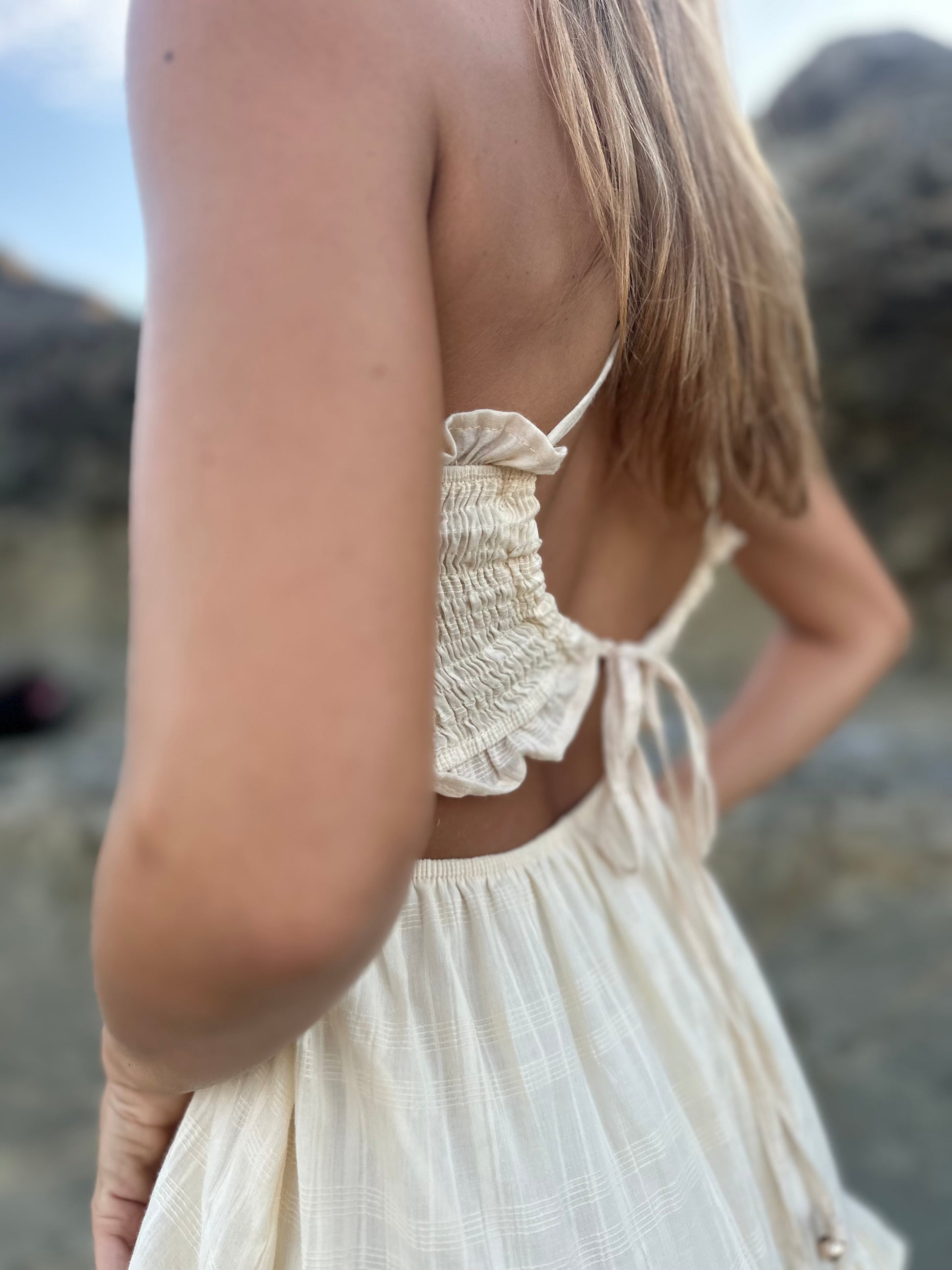 Vestido corto y ligero, perfecto para los días de sol. Su top con hilo elástico se ajusta cómodamente al cuerpo, realzando la figura, mientras que las delicadas tiras en cruz que se atan en la espalda añaden un toque sofisticado y ajustable. Los detalles de vuelitos aportan movimiento y un aire romántico, ideal para un look fresco y femenino.